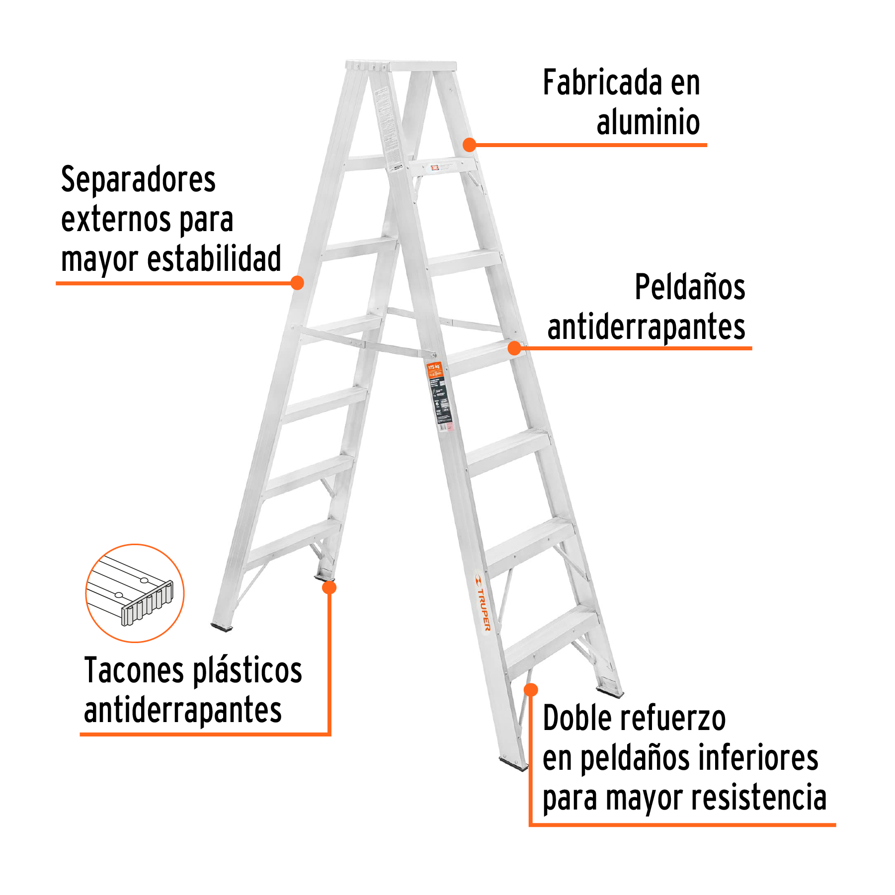 - Doble refuerzo en peldaños inferiores para mayor resistencia