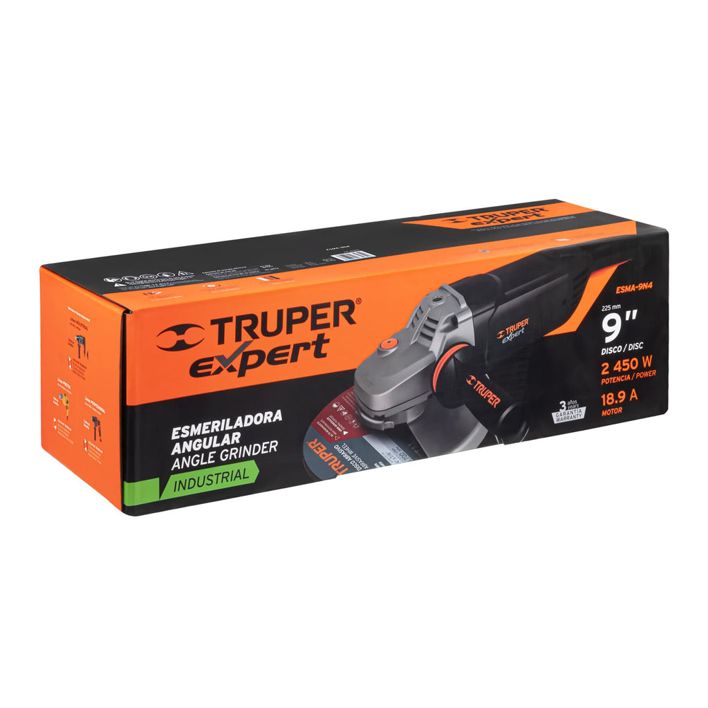 Especificaciones: Capacidad de disco 9" (228.5mm), corriente 16 A, frecuencia 60 Hz, peso 5.5 kg, potencia 2,000 W, tensión 120 V, velocidad 6,700 rpm, incluye 1 disco abrasivo de 9" (228.5mm), 1 llave de 2 puntas, 1 mango auxiliar, carbones de repuesto