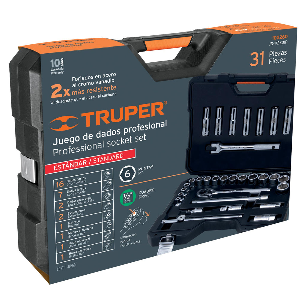 El juego de herramientas Truper JD-1/2X31P es el aliado indispensable para trabajos de mecánica general que requieren un alto torque. Con un cuadro de 1/2" (12.7 mm) y un enfoque total en medidas estándar (SAE), este kit de 31 piezas ofrece la robustez necesaria para enfrentar pernos y tuercas de gran tamaño con total confianza.