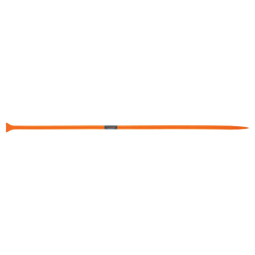 Fabricada en acero con recubrimiento de pintura en polvo texturizada color naranja Doble tratamiento térmico Sección hexagonal Escoplo y punta más agudos para terrenos duros