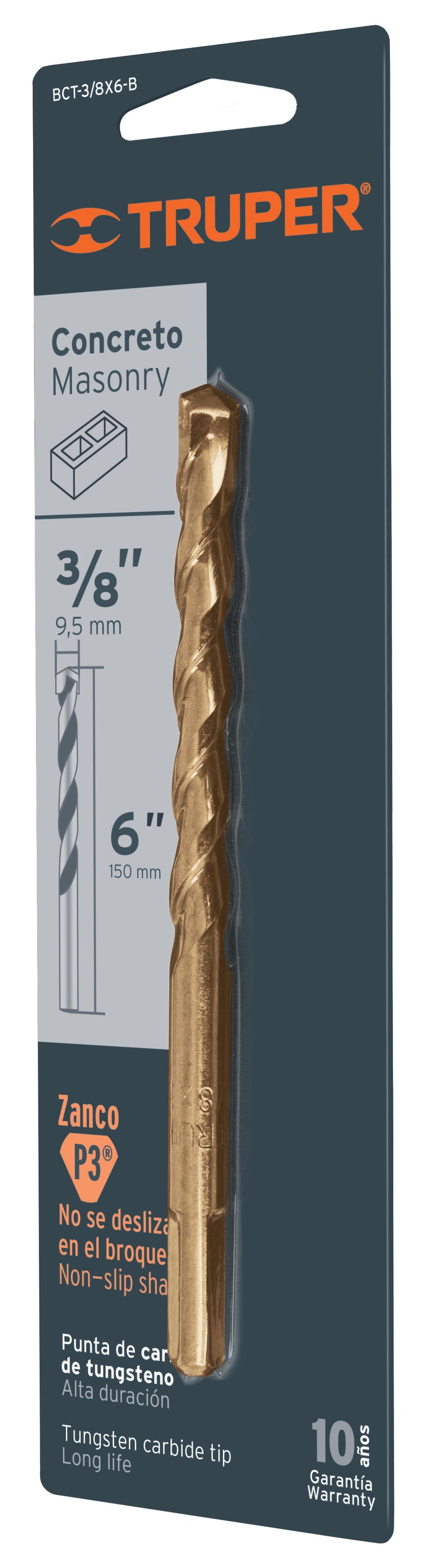 Especificaciones: Diámetro 3/8", largo 6", zanco 11/32", ángulo de la punta 130°