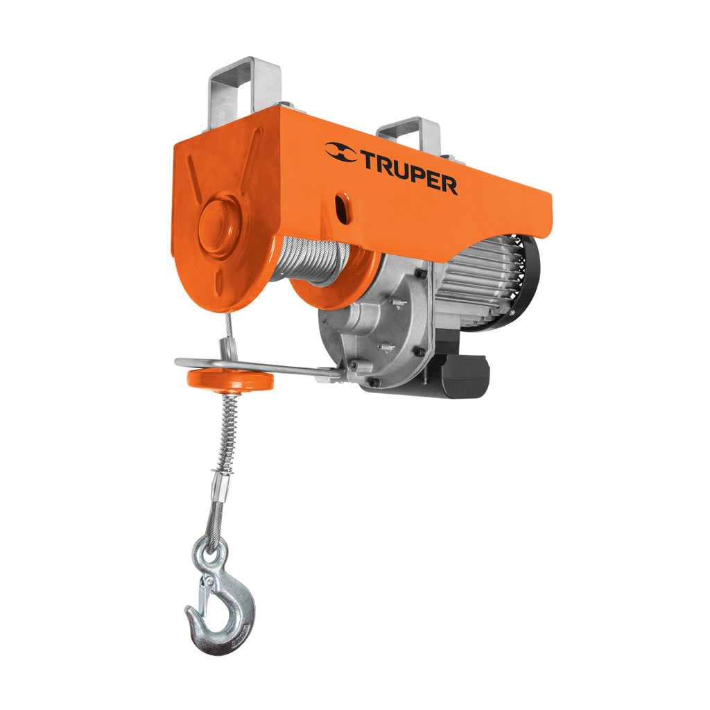 Especificaciones: Capacidad de línea sencilla 500kg, capacidad de línea doble 1,000kg, potencia 1,500W, tensión/frecuencia: 127V/60Hz, corriente 13.1A, apertura de gancho 21mm, Ø cable 5.6mm, dimensiones B 47 x A 26 x F17cm, peso 29kg, levantamiento 6m línea doble 12m línea sencilla, ciclo de trabajo recomendado 1 min. de trabajo x 10 min. de descanso, máximo diario 3h