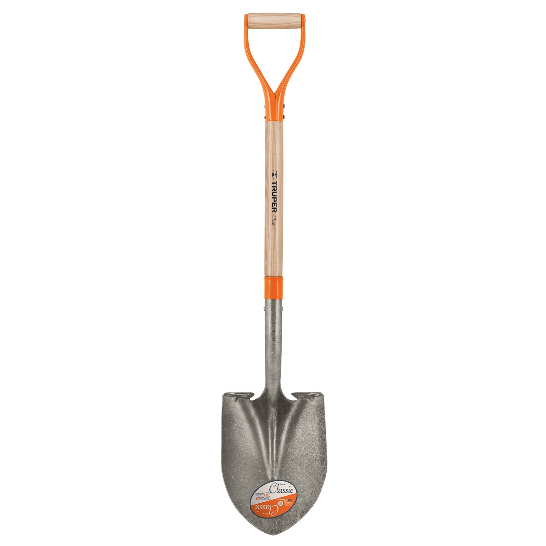 Pala Redonda Classic Mango/Madera Puño "Y" Mango fabricado en madera de fresno con acabado enlacado y puño recto electrosoldado Cabeza fabricada en acero al carbono con acabado en pintura híbrida en polvo transparente Arillo metálico fabricado en acero al carbono con recubrimiento galvanizado Ensamble con casquillo crimpado y cabeza con hombros rolados atrás